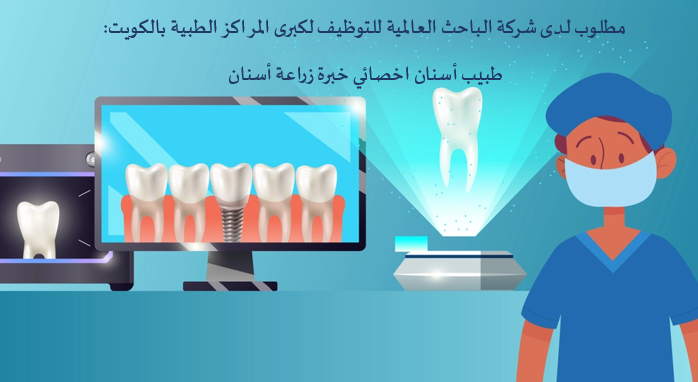 مطلوب لدى شركة الباحث العالمية للتوظيف طبيب اسنان اخصائي خبرة زراعة أسنان لدى كبرى المراكز الطبية في الكويت